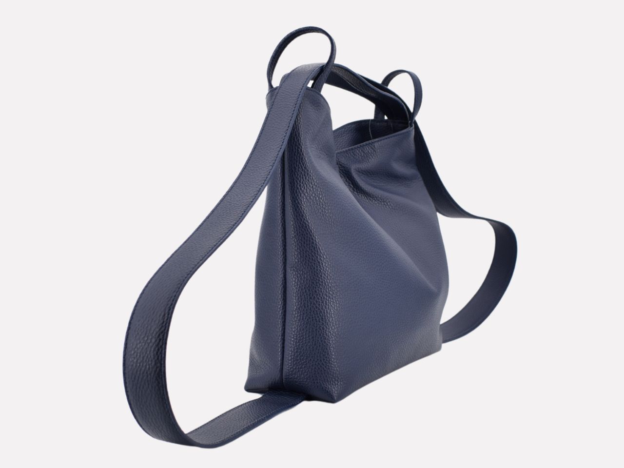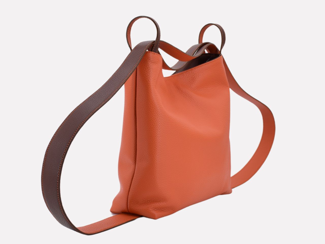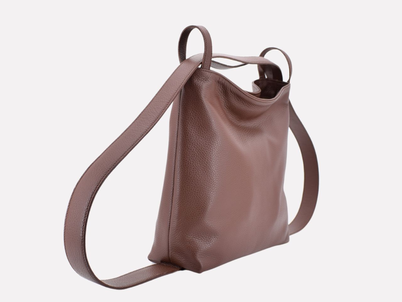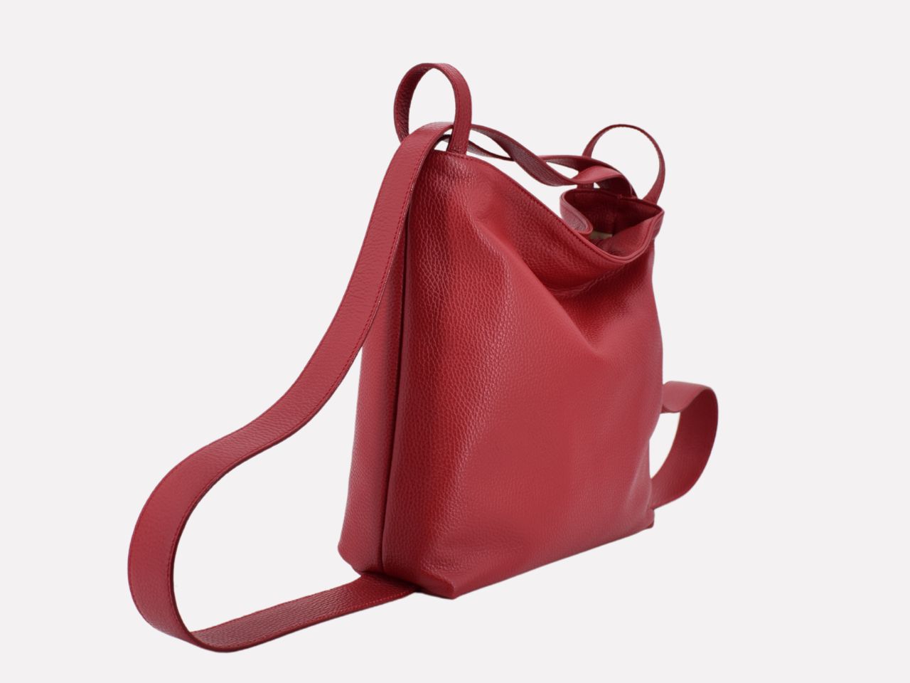 Italian leather shoulder bag with strap pullable on each side to turn it in a backpack, zipper closure, one inside pocket with zipper, inner lining. Carmenta is designed, made and crafted in Rome by Riccardo Mancini. Limited production, unique character.