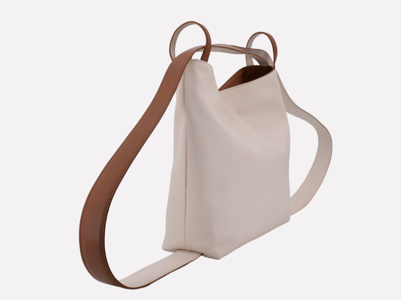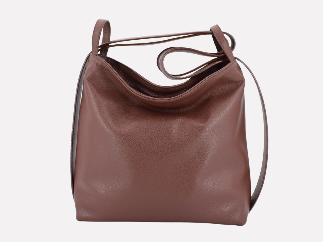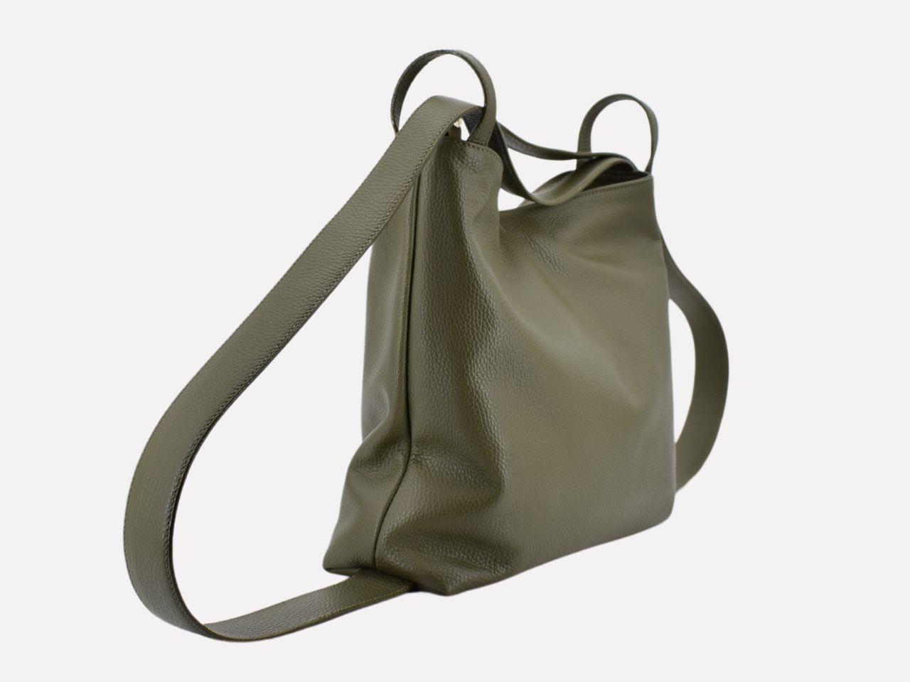Italian leather shoulder bag with strap pullable on each side to turn it in a backpack, zipper closure, one inside pocket with zipper, inner lining. Carmenta is designed, made and crafted in Rome by Riccardo Mancini. Limited production, unique character.