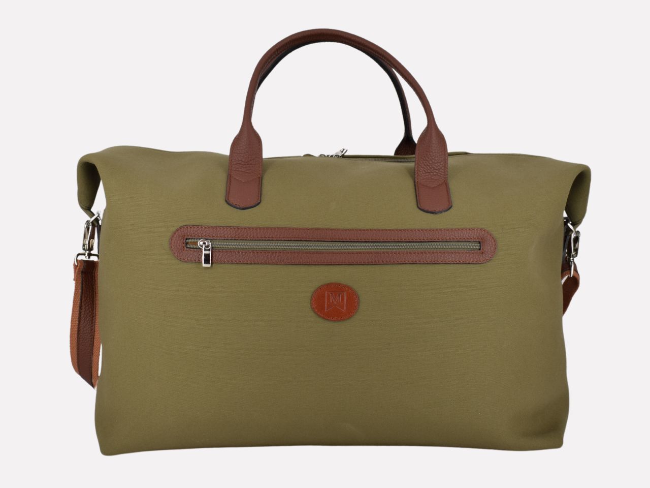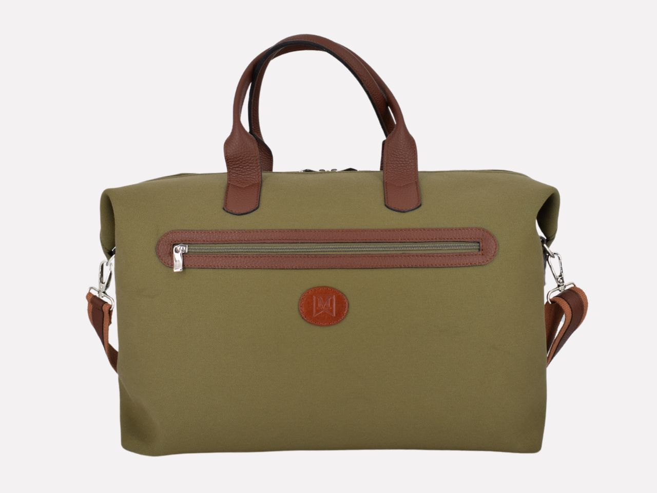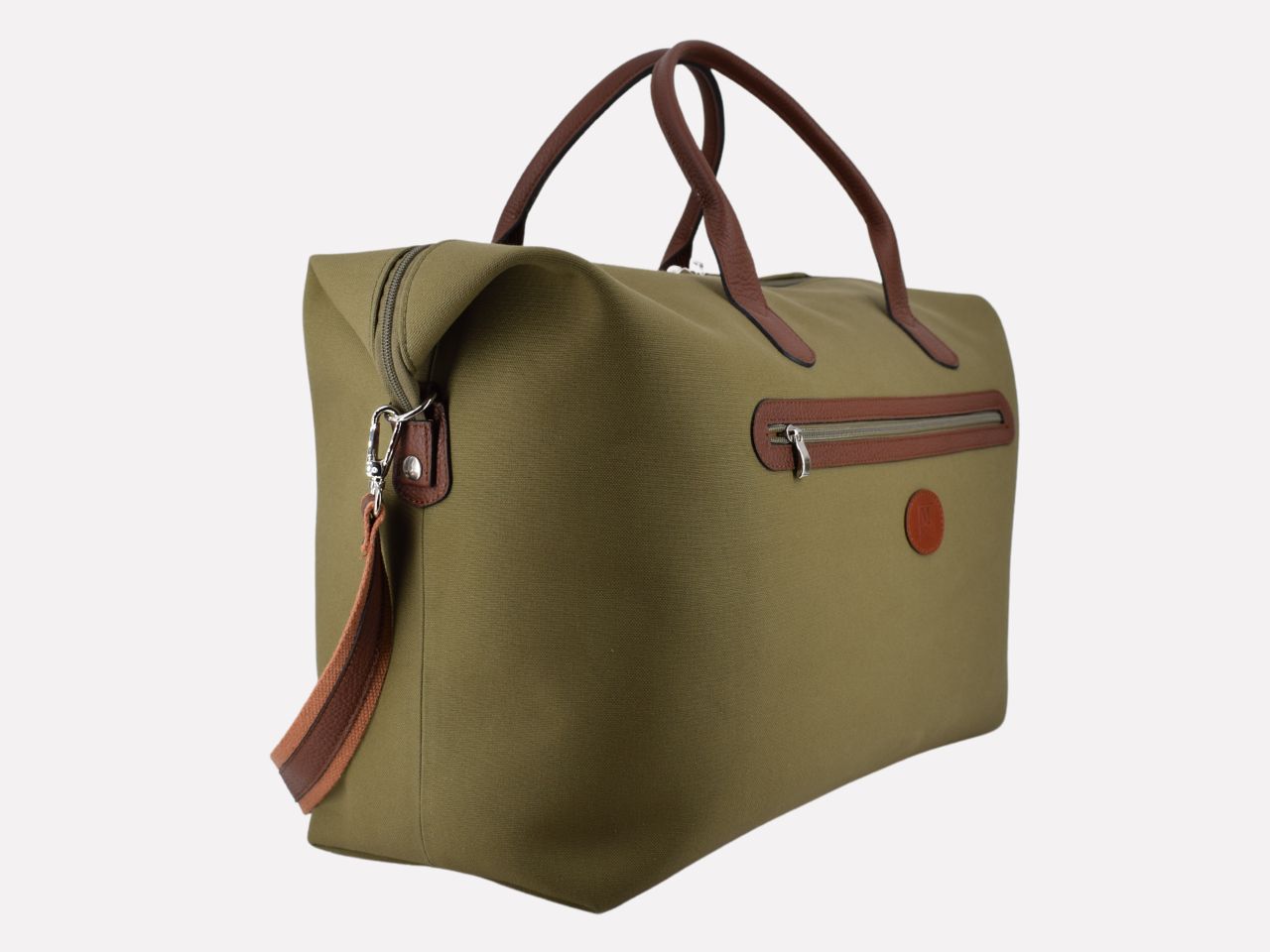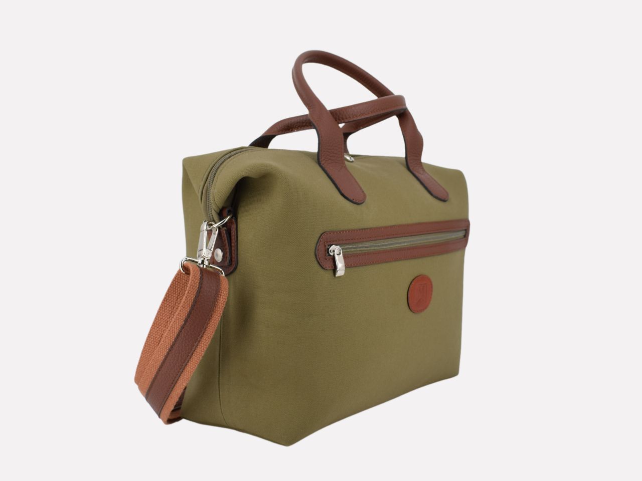 Italian handmade travel bag, waterproof canvas with hammered leather trimmings, two-tone (green canvas and cognac leather), canvas lining. One external pocket with zip, one inside pocket with zip, handle and shoulder strap. Three sizes: small, medium and large. Globe is designed, made and crafted in Italy by Mancini Leather, Rome. Limited production, unique character.