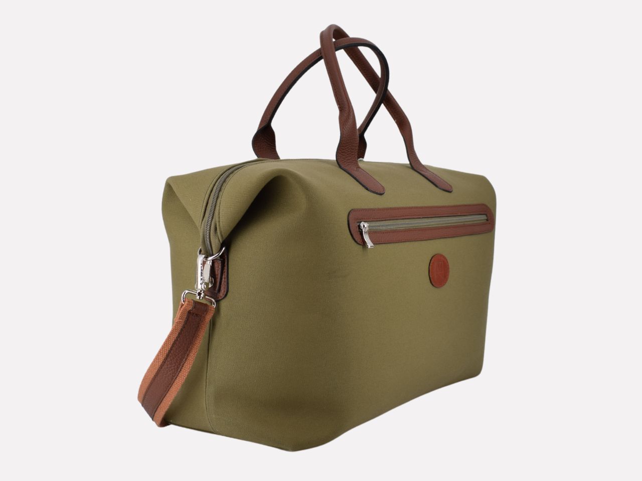 Globe, italian handmade travel bag, waterproof canvas with hammered leather trimmings, two-tone (green canvas and cognac leather), canvas lining. Three sizes: small, medium and large.